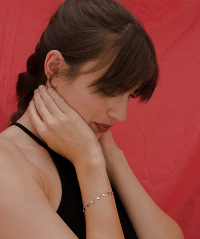 Junge Dame trägt rose farbenes Armband mit Ginkgo Anhängern vor rotem Hintergrund