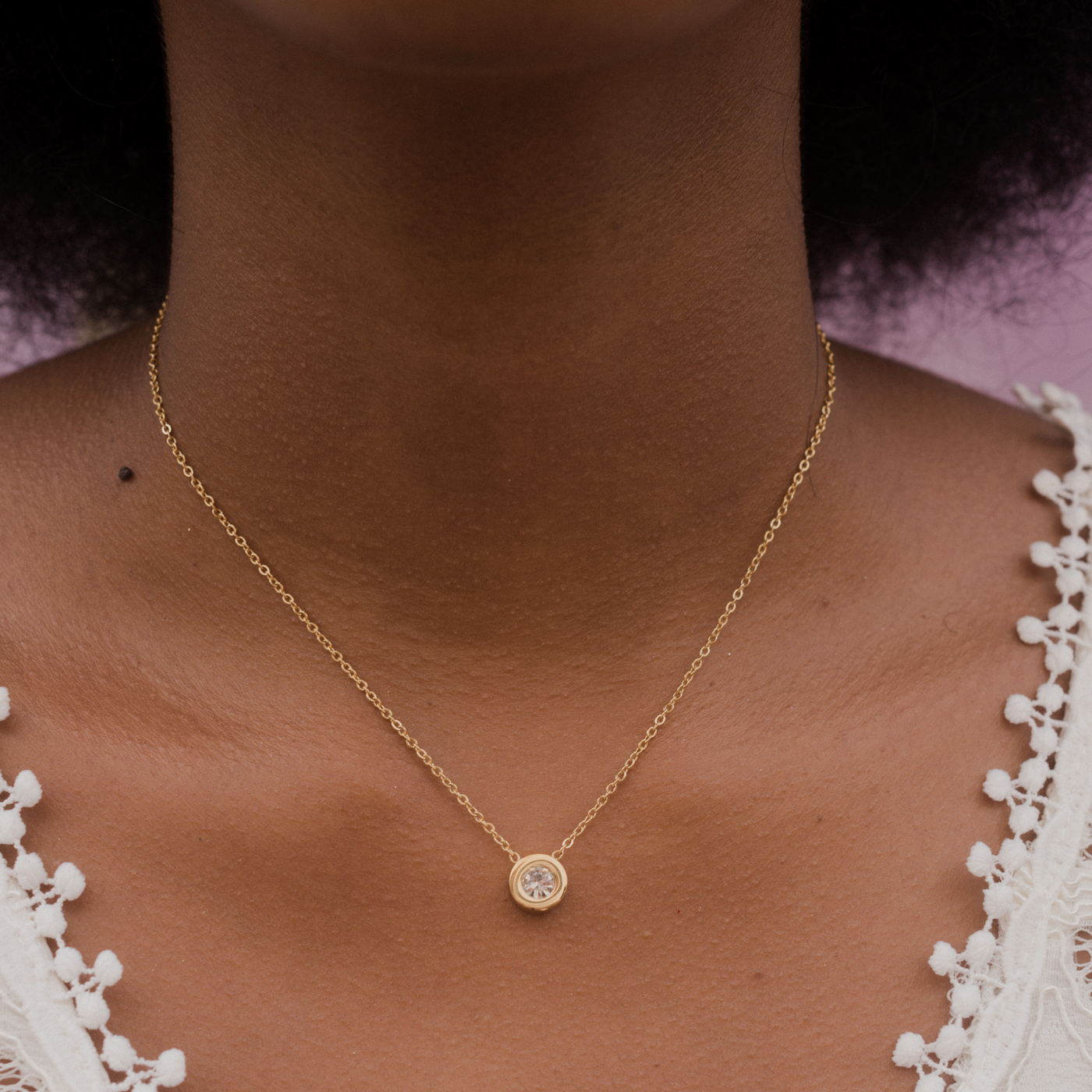 Junge Frau trägt Gold kette mit minimalistischem Strassstein Anhänger